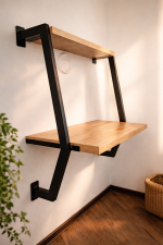 Birou Wall Line este o piesă premium, realizată manual cu atenție la fiecare detaliu. Combinația dintre oțel solid și lemn natural oferă un echilibru între rezistență și un aspect curat, modern. Designul montat pe perete economisește spațiu și se integrează ușor în orice interior.
